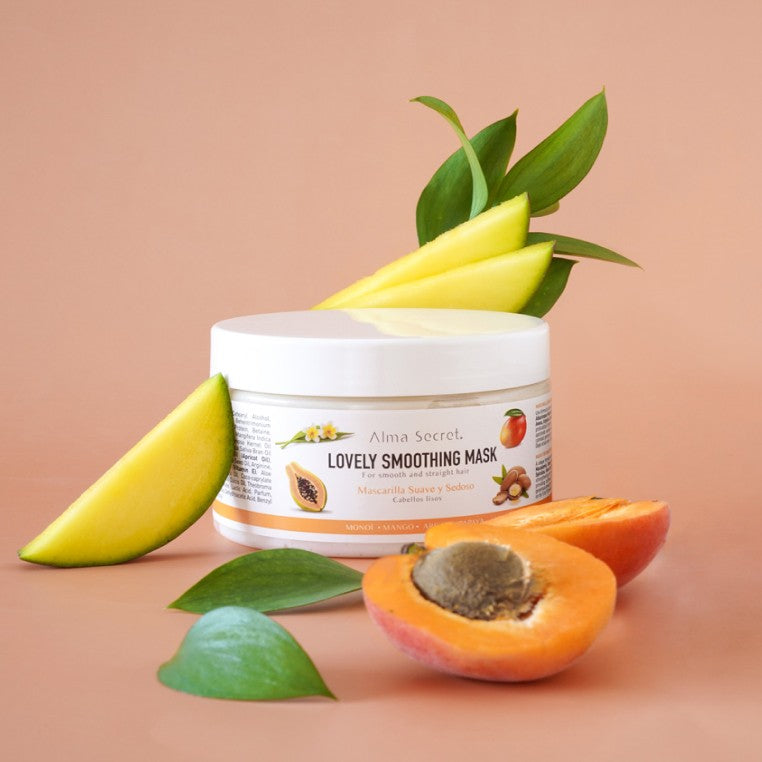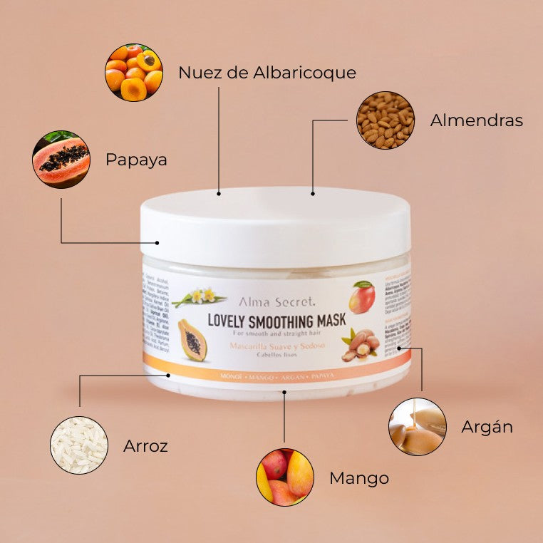 ALMA SECRET Lovely Smoothing Mask est un masque nourrissant qui renforce et restructure la fibre, démêle et contrôle les frisottis pour des cheveux doux, souples et brillants. ALMA SECRET Lovely Smoothing : Lissage et nutrition intense ALMA SECRET Lovely Smoothing combine 9 huiles non grasses, protéines d’avoine et actifs réparateurs pour lisser, protéger et sublimer les cheveux. DESCRIPTION Masque lissant & anti-frisottis qui nourrit en profondeur, renforce et restructure la fibre tout en démêlant et en apportant souplesse, brillance et corps. Il crée un bouclier protecteur face à la chaleur et aux traitements chimiques, aide à prévenir la casse et protège la couleur. Caractéristiques : Flacon de 250 ml Vegan & Cruelty-free Sans silicones Approuvé pendant la grossesse Tous types de cheveux (spécial lisses) Compatible cheveux colorés Bouclier thermique et chimique Pour qui ? Cheveux lisses, rebelles/encrespés ou ternes. Fibres sèches, fragilisées, cassantes. Idéal en usage après chaque lavage pour maintenir douceur & brillance. BIENFAITS & INGRÉDIENTS CLÉS Bénéfices clés : Nourrit en profondeur : Répare la cuticule capillaire pour des cheveux restructurés Contrôle le frizz : Facilite le démêlage pour une chevelure douce et soyeuse Bouclier thermique/chimique : Scelle l’humidité, réduit la casse et protège de l’excès de chaleur Protège la couleur : Préserve l’éclat des cheveux teints Actifs & actions : 9 huiles non grasses : Monoï de Tahiti, Mangue, Argan, Riz, Noyau d’abricot, Macadamia, Pépin de raisin, Amande & Cacao – nutrition, brillance, réparation, anti-frizz Protéines d’avoine : Forment un film protecteur anti-déshydratation, renforcent & assouplissent Arginine : Acide aminé clé de la kératine, aide à fortifier et lisser Spiruline : Revitalise la fibre, booste vitalité & brillance Aloe vera : Conditionne et apporte élasticité Papaye : Antioxydants, vitamines, minéraux – aide à réparer les cheveux rebelles/ternes CONSEILS D’UTILISATION Application : Après le shampooing, appliquer une généreuse quantité sur cheveux lavés et humides Répartir des mi-longueurs aux pointes Laisser poser 5–10 minutes Rincer à l’eau tiède Multimasking : Alternez avec le Masque Extreme Repair n°1 (si cheveux très abîmés : un lavage sur deux ; sinon, n°1 tous les 3–4 lavages et Lovely Smoothing le reste du temps). Conseil expert : Utiliser de préférence avec un shampooing sans sulfates pour préserver les bénéfices du masque. Texture & fini : Crème fondante qui enrobe la fibre sans l’alourdir. Cheveux souples, brillants, disciplinés avec un lissage durable.