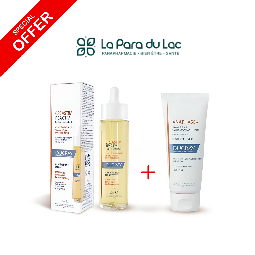 Duo capillaire intensif 60 ml + 100 ml pour freiner la chute de cheveux et stimuler la croissance dès le premier mois. DESCRIPTION Ce pack associe la lotion Creastim Reactiv et le shampoing Anaphase+ pour lutter efficacement contre la chute de cheveux liĂ©e au stress, post-partum ou changement de saison. Une routine complète pour stimuler, renforcer et densifier la chevelure. BIENFAITS & INGRÉDIENTS CLÉS – TĂ©trapeptide, crĂ©atine, vitamines B : stimulent la croissance et renforcent la fibre capillaire – Lotion : rĂ©duit la chute dès 1 mois – Shampoing : revitalise le cuir chevelu, donne volume et souplesse CONSEILS D’UTILISATION Lotion : appliquer 3 fois/semaine sur cuir chevelu sec, en massant lĂ©gèrement. Shampoing : 2 Ă 3 fois/semaine, en complĂ©ment de la lotion.