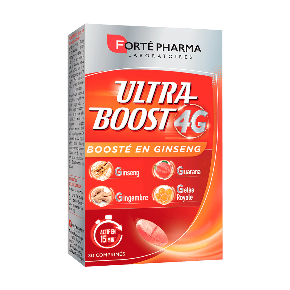 Complément alimentaire 30 comprimés, à base de Ginseng, Rhodiola, Guarana et vitamines pour booster l’énergie physique et mentale. DESCRIPTION Vitalité 4G Ultra Boost de Forte Pharma est un concentré d’énergie naturelle associant 4 plantes adaptogènes et des vitamines pour lutter contre la fatigue et le stress tout en stimulant la performance physique et mentale. BIENFAITS & INGRÉDIENTS CLÉS – Ginseng, Rhodiola, Eleuthérocoque, Guarana : plantes adaptogènes et stimulantes – Gelée royale, Acérola : tonifiants naturels – Vitamines B6, B12, C, Magnésium, Zinc, CoQ10 : soutiennent l’énergie et la concentration CONSEILS D’UTILISATION Prendre 1 comprimé par jour, le matin avec un verre d’eau. Cure de 30 jours. Déconseillé aux enfants, femmes enceintes ou allaitantes.
