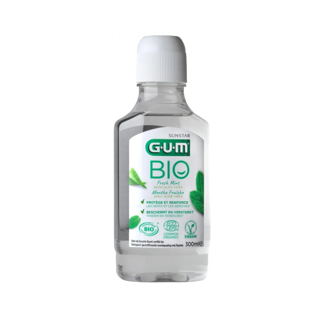 Bain de bouche rafraĂ®chissant 300 ml, formulĂ© Ă base d’ingrĂ©dients bio et d’aloe vera pour une haleine fraĂ®che et des gencives protĂ©gĂ©es. DESCRIPTION Le bain de bouche GUM Bio Ă la menthe fraĂ®che et Ă l’aloe vera rafraĂ®chit l’haleine, protège les gencives, et respecte les bouches sensibles grâce Ă sa formule sans alcool. BIENFAITS & INGRÉDIENTS CLÉS – Aloe Vera apaisant et menthe poivrĂ©e pour une haleine fraĂ®che – Extrait de thĂ© vert : action antioxydante et antibactĂ©rienne – Sans alcool, doux pour les gencives et respectueux de la flore buccale CONSEILS D’UTILISATION Utiliser après le brossage, 2 fois par jour. Rincer 30 secondes avec 10-15 ml sans diluer. Ne pas manger/boire immĂ©diatement après utilisation.
