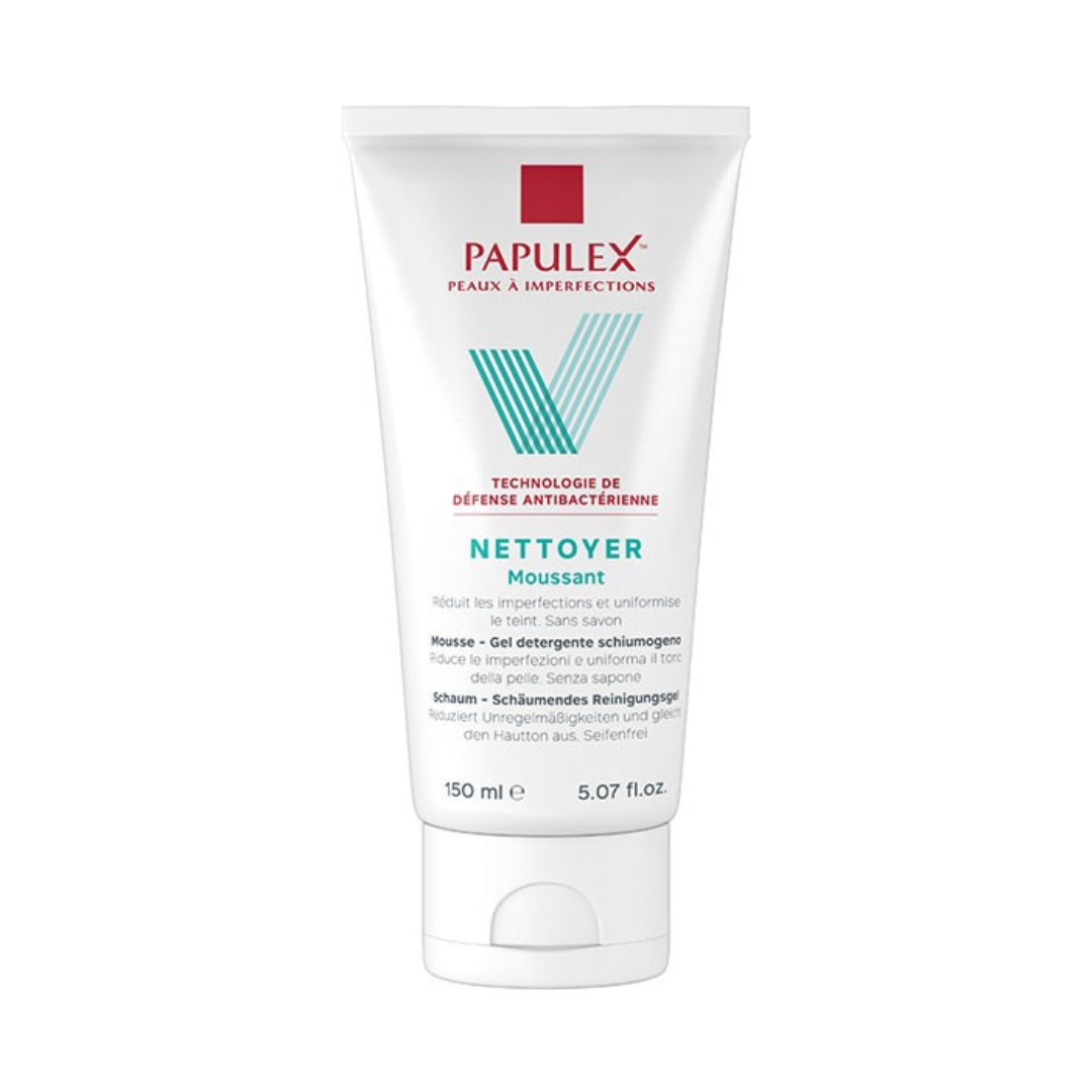 Nettoyant moussant purifiant 150ml qui Ă©limine les impuretĂ©s, prĂ©vient les imperfections et procure une agrĂ©able sensation de fraĂ®cheur. DESCRIPTION Le gel nettoyant moussant Papulex purifie en profondeur les peaux sujettes Ă l’acnĂ©, diminue la prolifĂ©ration bactĂ©rienne et favorise la disparition des imperfections tout en laissant une sensation de fraĂ®cheur. BIENFAITS & INGRÉDIENTS CLÉS – Niacinamide : rĂ©duit les rougeurs et apaise la peau – Agents nettoyants doux : Ă©liminent l’excès de sĂ©bum sans irriter – Texture moussante fraĂ®che, adaptĂ©e Ă un usage quotidien CONSEILS D’UTILISATION Appliquer sur le visage humide, masser doucement puis rincer. Ă€ utiliser matin et soir. Éviter le contact avec les yeux et conserver Ă l’abri du soleil.