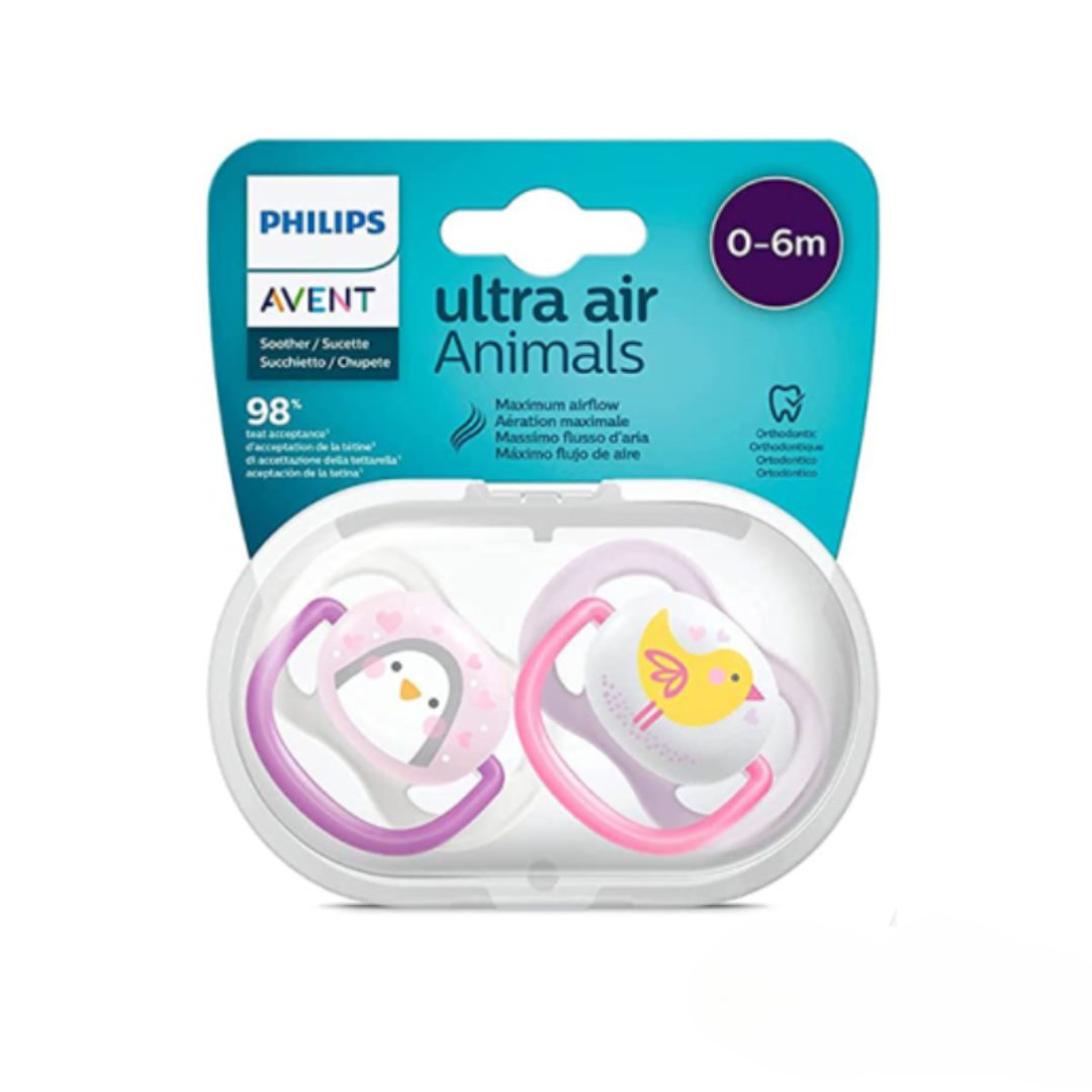Sucettes respirantes lot de 2, adaptĂ©es aux bĂ©bĂ©s de 0 Ă 6 mois, alliant douceur, sĂ©curitĂ© et design ludique pour apaiser en toute confiance. DESCRIPTION Les sucettes Philips Avent Ultra Air Animals 0-6M sont conçues pour les nourrissons. Leur tĂ©tine orthodontique respecte le dĂ©veloppement naturel, tandis que leur design lĂ©ger et aĂ©rĂ© prĂ©serve la peau fragile du visage. BIENFAITS & INGRÉDIENTS CLÉS – Trous d’aĂ©ration extra-larges : prĂ©viennent rougeurs et irritations – TĂ©tine en silicone orthodontique : douce et respectueuse du dĂ©veloppement – Motifs animaux mignons : look ludique adaptĂ© aux petites filles CONSEILS D’UTILISATION Utiliser dès la naissance jusqu’à 6 mois. Laver rĂ©gulièrement et stĂ©riliser avant chaque utilisation. Ă€ remplacer dès les premiers signes d’usure.