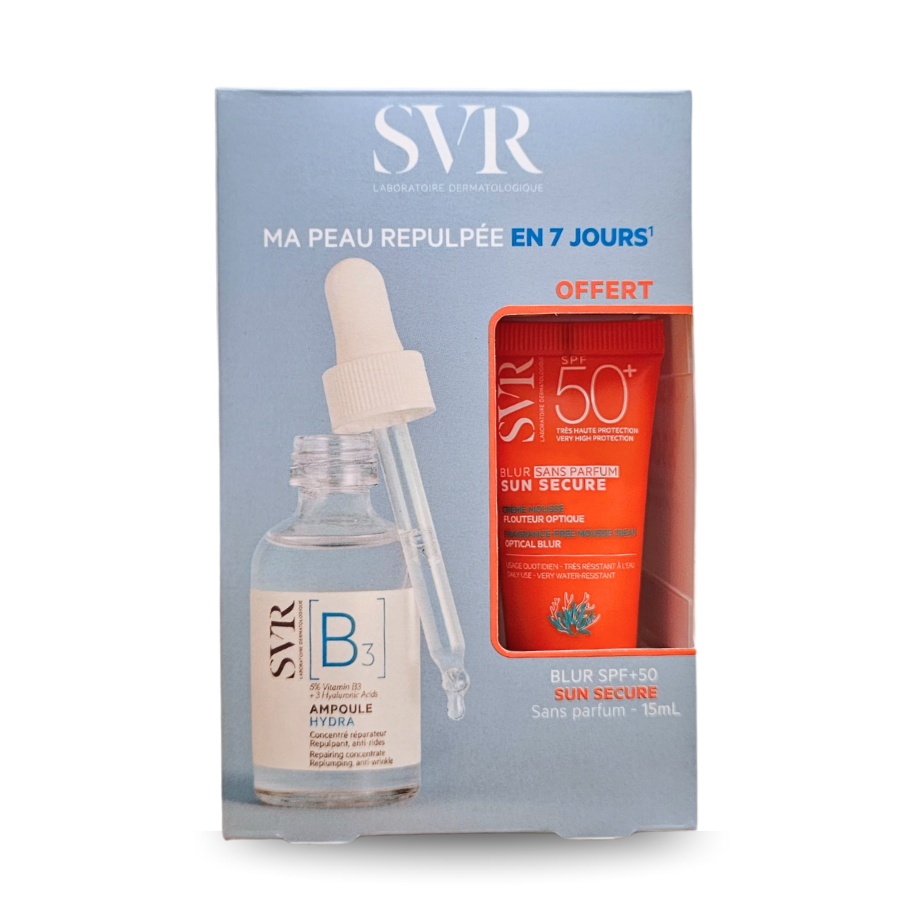 Pack SVR Ampoule B – Hydratation & Protection – SVR Ampoule B3 Hydra 30ml : SĂ©rum ultra-concentrĂ© en vitamine B3, il apaise, hydrate intensĂ©ment et repulpe les peaux sensibles et dĂ©shydratĂ©es. Grâce Ă ses 3 acides hyaluroniques, il rĂ©duit les tiraillements, renforce la barrière cutanĂ©e et attĂ©nue visiblement les rides. – SVR Sun Secure Blur SPF50+ 15ml – OFFERT : Crème-mousse solaire sans parfum, elle floute les imperfections, unifie le teint et offre une haute protection UV avec un fini doux et veloutĂ©.
