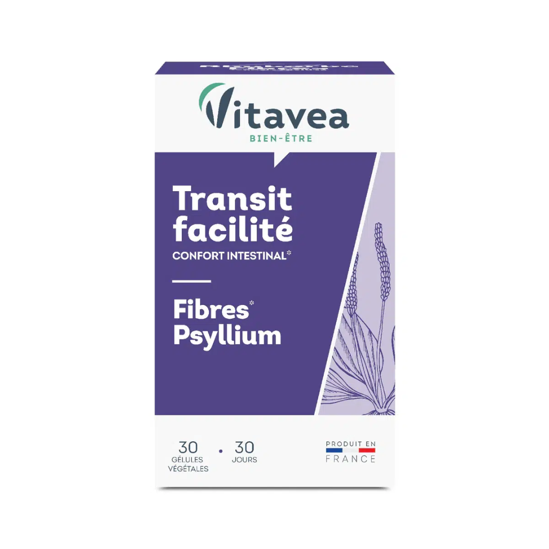 VITAVEA Transit Facilité Fibres Psyllium 30 gélules est un complément alimentaire pour les personnes souffrant de paresse digestive ou de transit irrégulier, grâce à une formule riche en fibres solubles de psyllium et d’avoine pour une élimination douce et naturelle. Formulé avec des fibres végétales d’origine naturelle, il favorise un transit intestinal régulier, apporte un confort digestif durable et contribue à l’équilibre du microbiote dès les premières semaines. Pour un transit facilité et un confort abdominal retrouvé au quotidien. Description VITAVEA Transit Facilité Fibres Psyllium 30 gélules est la solution transit pour les personnes qui souffrent de paresse digestive, de ballonnements ou d’un transit irrégulier et souhaitent retrouver un confort intestinal naturel. Formulé avec de l’extrait de psyllium (Plantago indica) et de la poudre d’avoine, il apporte des fibres solubles qui gélifient dans l’intestin pour faciliter le transit de manière douce et progressive. Sa gélule d’origine végétale garantit une formule respectueuse et bien tolérée. Contribue à : Faciliter et régulariser le transit intestinal Favoriser une élimination douce et naturelle Réduire les ballonnements et l’inconfort abdominal Apporter un confort digestif durable au quotidien Soutenir l’équilibre du microbiote intestinal Convient aux adultes en cas de paresse digestive ponctuelle ou chronique Bienfaits & Ingrédients Innovation VITAVEA Transit Facilité : Psyllium (Plantago indica) – Riche en fibres solubles, il gélifie dans l’intestin pour faciliter le transit de manière douce et non irritante Poudre d’avoine (Avena sativa) – Source de fibres complémentaires pour un effet régulateur renforcé sur le transit Gélule végétale – Formule sans gélatine animale, douce et bien tolérée par l’organisme Composition complète : Poudre d’avoine (Avena sativa) (gluten) · Extrait de psyllium (Plantago indica) · Gélule végétale (cellulose) · Carbonate de calcium · Sels de magnésium d’acides gras. Contient du gluten (avoine). Déconseillé en cas d’usage concomitant de médicaments. Conseils d’utilisation Posologie : 1 gélule par jour, le soir. Mode d’emploi : Prendre 1 gélule chaque soir au moment du repas Avaler avec un grand verre d’eau Boire au minimum 1,5L d’eau par jour pour favoriser l’action des fibres Ne pas dépasser la dose journalière recommandée Format : 30 gélules végétales – cure de 30 jours Déconseillé en cas d’usage concomitant de médicaments. À conserver dans un endroit sec et frais. Tenir hors de la portée des enfants. Les compléments alimentaires ne se substituent pas à une alimentation variée et équilibrée.
