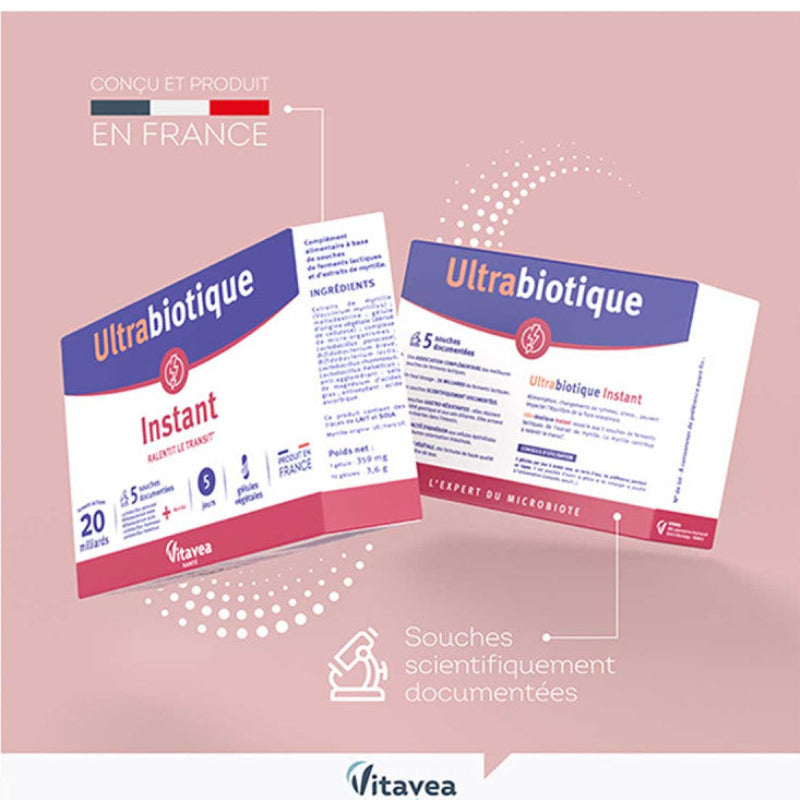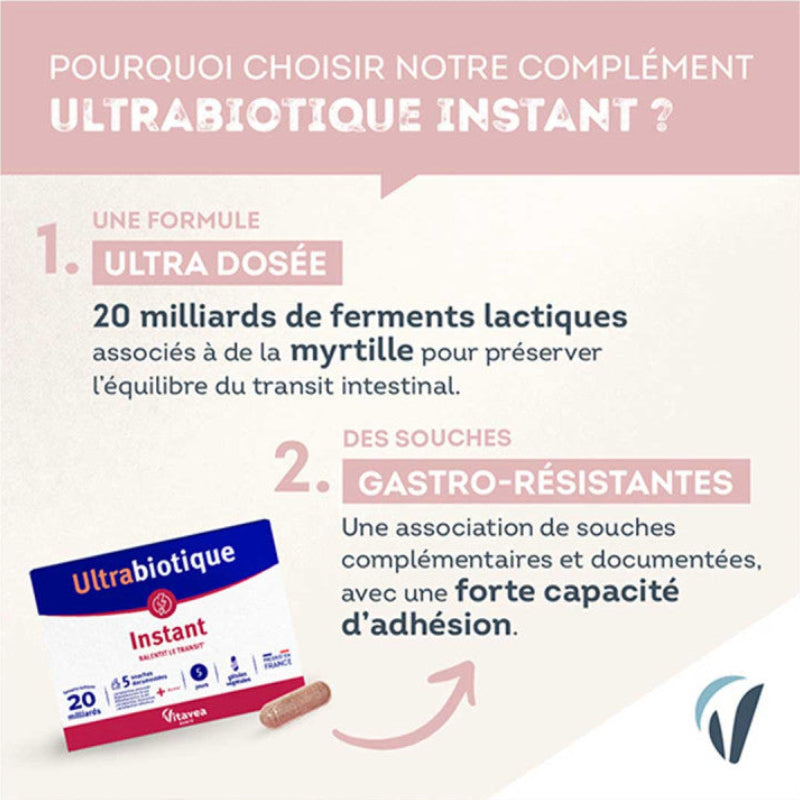 VITAVEA Ultrabiotique Instant est un complément alimentaire probiotique pour les personnes souhaitant rééquilibrer leur flore intestinale et retrouver un transit normal, grâce à une formule innovante associant 5 souches probiotiques à haut dosage et haute capacité d’adhésion. Formulé pour agir rapidement sur le confort digestif, il rééquilibre la flore intestinale, apaise les irritations et régularise le transit dès les premières prises. Pour un microbiote équilibré et un confort intestinal optimal au quotidien. Description VITAVEA Ultrabiotique Instant est la solution probiotique complète pour les personnes souffrant de déséquilibre de la flore intestinale, de transit irrégulier ou d’inconforts digestifs qui souhaitent retrouver un confort intestinal naturel et durable. Sa formule galénique innovante associe 5 souches probiotiques sélectionnées pour leur haut dosage et leur grande capacité d’adhésion à la muqueuse intestinale, garantissant une efficacité optimale et une action rapide sur le transit et la flore. Contribue à : Rééquilibrer la flore intestinale et le microbiote Retrouver naturellement un transit normal et régulier Réduire les épisodes de diarrhée et les selles fréquentes Apaiser les irritations et inconforts intestinaux Favoriser une digestion plus harmonieuse au quotidien Convient aux adultes en cas de déséquilibre digestif ou après une antibiothérapie Bienfaits & Ingrédients Innovation VITAVEA Ultrabiotique Instant : 5 souches probiotiques à haut dosage – Sélectionnées pour leur haute capacité d’adhésion à la muqueuse intestinale pour une colonisation efficace et durable Action rapide – Forme galénique innovante pour un soulagement instantané des symptômes digestifs Flore intestinale rééquilibrée – Restaure l’équilibre du microbiote perturbé par le stress, les antibiotiques ou une alimentation déséquilibrée Gélule facile à avaler – Peut être prise à tout moment de la journée pour un confort optimal Composition : 5 souches probiotiques sélectionnées à haut dosage et haute capacité d’adhésion intestinale. Complément alimentaire à utiliser dans le cadre d’une alimentation variée, équilibrée et d’un mode de vie sain. Conseils d’utilisation Posologie : 1 gélule par jour. Mode d’emploi : Prendre 1 gélule par jour avec un grand verre d’eau De préférence pendant les repas pour une meilleure tolérance Peut être prise à tout moment de la journée selon les besoins Renouveler la cure après une antibiothérapie ou en cas de déséquilibre digestif Ne pas dépasser la dose journalière recommandée. À conserver à l’abri de la chaleur et de l’humidité. Tenir hors de la portée des enfants. Les compléments alimentaires ne se substituent pas à une alimentation variée et équilibrée.